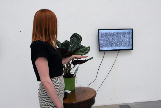 Interactive online installation Aestheticized Informations is an interactive online project which collects live internet data, including images and texts, about refugees and endangered species. An algorithm in the project's system automatically transforms this data into formal, aesthetic, moving visual images. It is possible to stop the process of data interpretation by touching the leaves of an indoor plant, but only for a couple of seconds. The project asks what is happening with online documentary information today. How do we understand, consume, and represent this information, especially when the subject matter is disturbing (or upsetting or difficult). Collaborators: Jurij Podgoršek (programming), Jakob Purg (robotics)