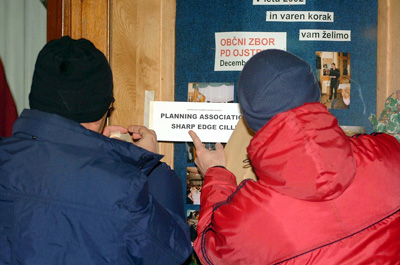 The night before the Slovenian national cultural holiday of 8th of February, Skupina (“Group”) made its second action. Around the town of Celje, public street signs and other text in the public space (e.g. names of shops and institutions on building facades) translations appeared next to the signs. What was originally in Slovenian now appeared in English, and vice-versa. But the translations were not literal – they created humourous word games. There was a very strong national reaction. The project was associated with the actions of the fascists when they occupied Celje in 1941 and quickly changed the public street signs and names into the German language. The following year, in 2004, Slovenia was to become part of the EU. The action attempted to bring attention to the possibility of a new language totalitarianism.